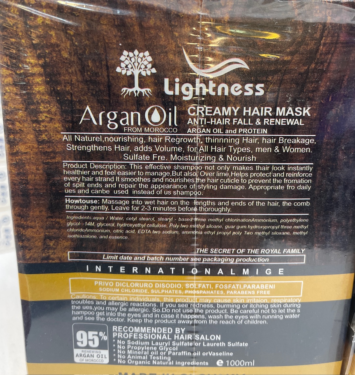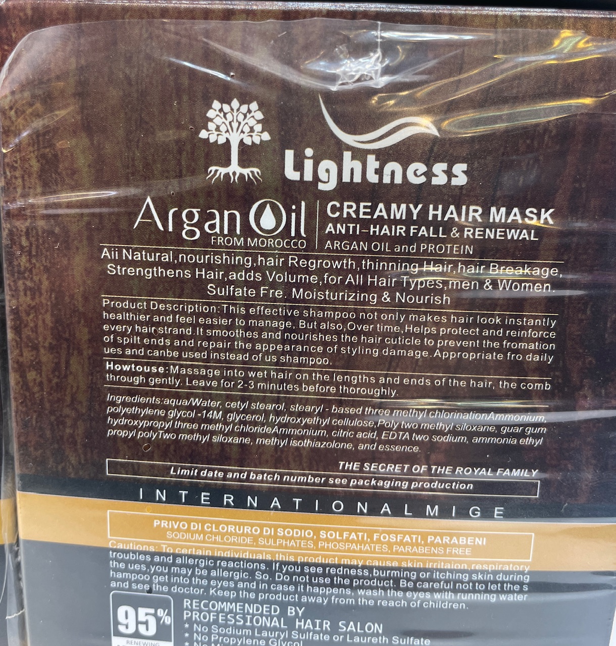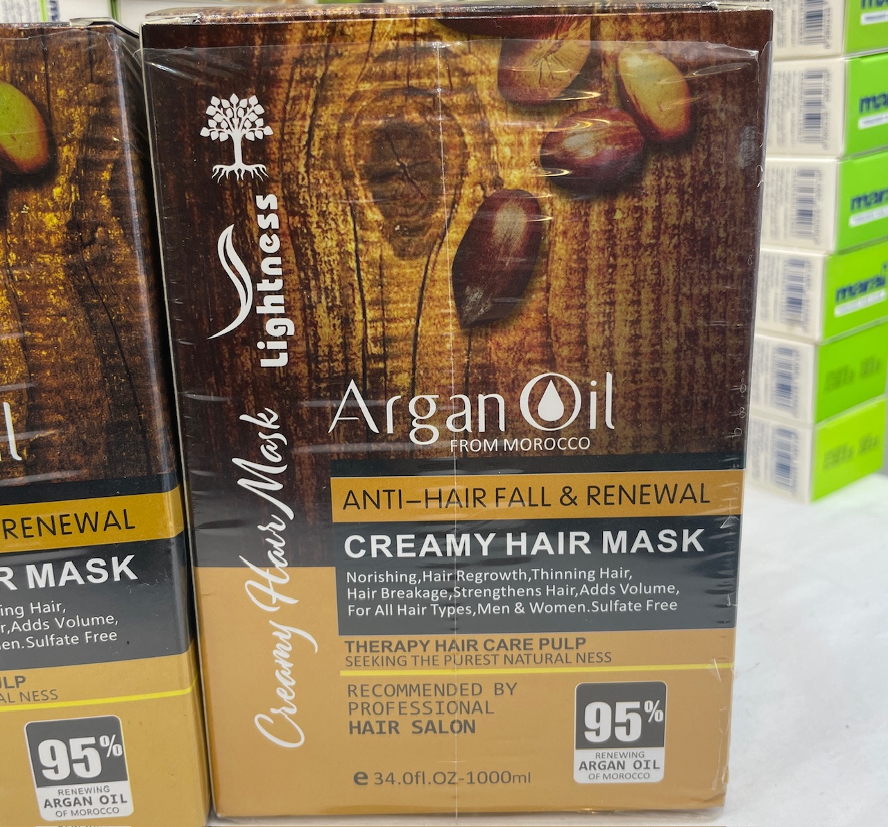 ماسک مو آرگان حاوی روغن ارگان مناسب برای رطوبت و درخشندگی پوست میباشد. این ماسک باعث تقویت ساقه ی مو و افزایش رشد مو میشود. همچنین این ماسک اگه با پوست سر هم برخورد کند هیچ ضری ندارد و افراد دارای مو های کوتاه نیز میتوانند از این ماسک استفاده کنند. ماسک مو ارگان لایتنس با داشتن ویتامیتE باعث و درخشندگی مو میشود. این ماسک با رشد ریشه های مو باعث افزایش رشد مو و جلوگیری از ریزش مو میشود. همچنین باعث افزایش استحکام موی سر میشود و از اسیب های ناشی از حرارت و رنگ های شیمیایی جلوگیری میکند. ماسک موی ارگان با داشتن روغن ارگان و مواد دیگر حاوی مواد مغذی مورد نیاز تار های پوست میباشد. مو های اسیب دیده در اثر حرارت یا رنگ کردن های مکرر را بهبود می بخشد و باعث بازسازی ساختار مو میشود. روغن ارگان باعث لطافت و نرمی موی سر شما میشود. خواص روغن آرگان برای مو: روغن ارگان مرطوب کننده ی بسیار خوبی است و به دلیل داشتن مقدار زیاد انتی اکسیدان و ویتامین Eبا خشکی و شوره ی سر مبارزه می کند.